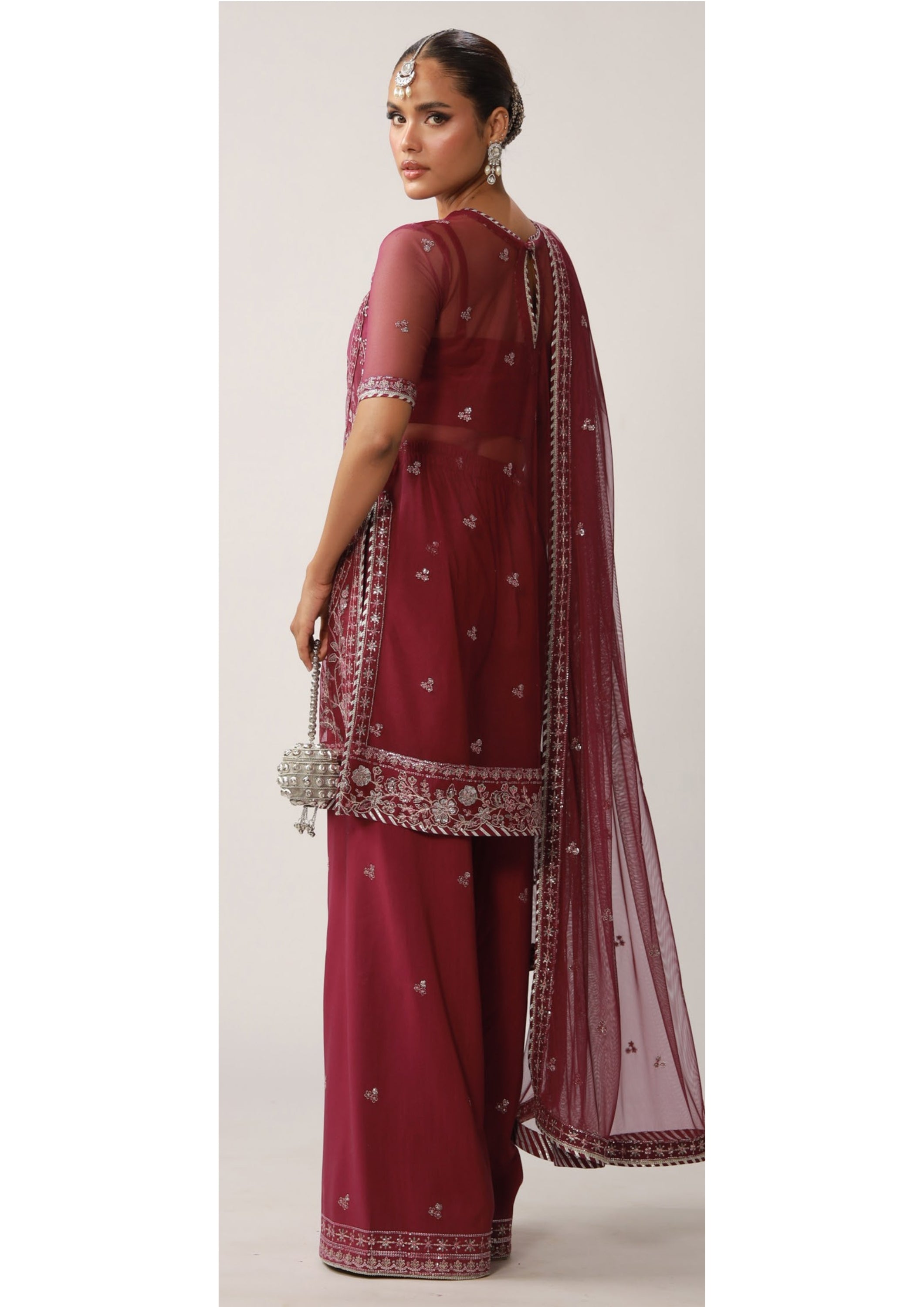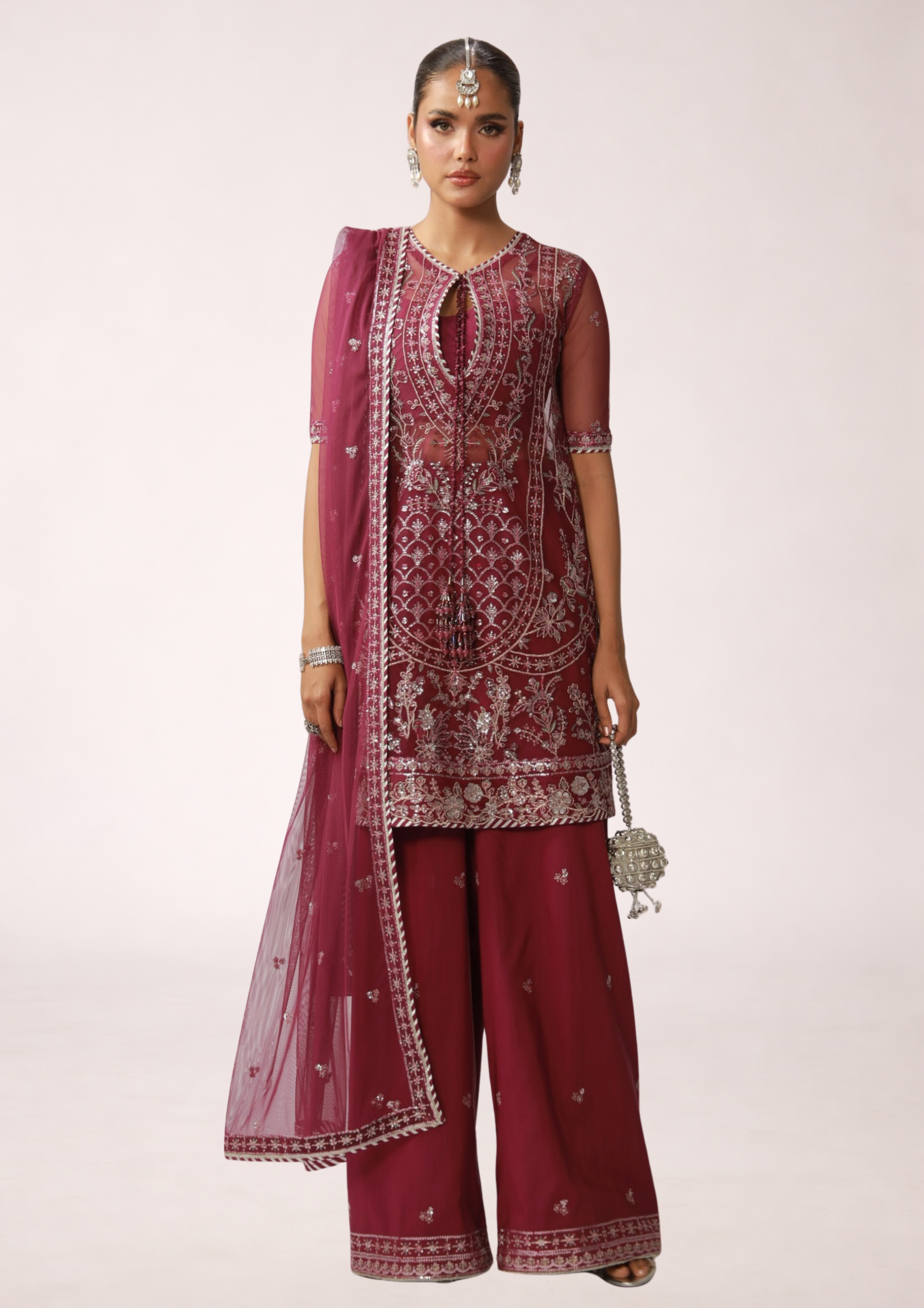 This elegant festive ensemble from Asim Jofa is designed on delicate net fabric with intricate embroidery that enhances its graceful appeal. Featuring detailed panels, rich borders, and a finely embroidered dupatta, this outfit is paired with an embroidered trouser to create a perfectly balanced festive look.