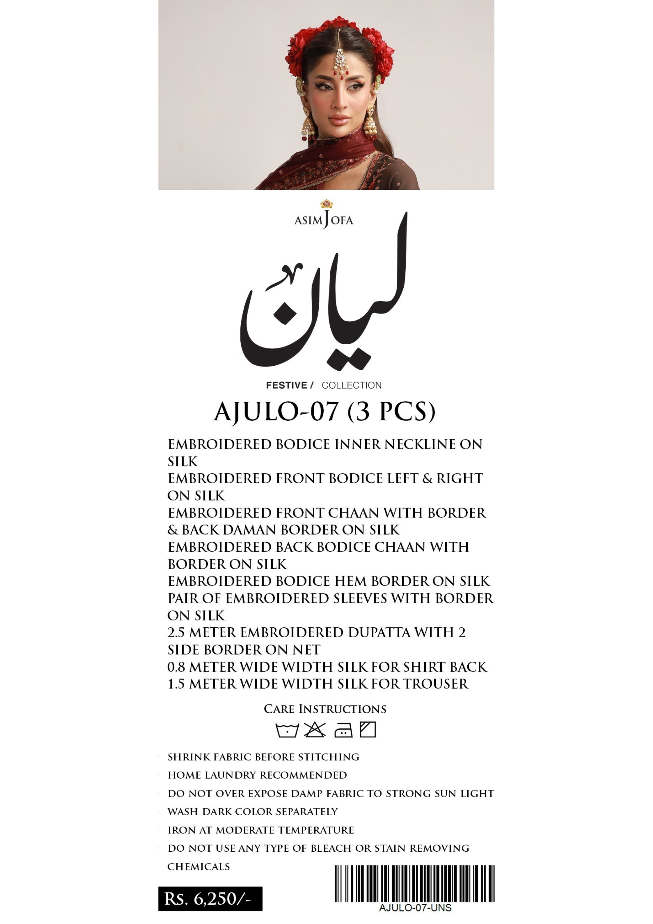This elegant festive ensemble from Asim Jofa is crafted on luxurious silk and net fabrics, featuring intricate embroidery that highlights fine craftsmanship and timeless design. With detailed bodice work, beautifully embroidered borders, and a graceful dupatta, this outfit is paired with silk fabric to create a refined and festive silhouette.