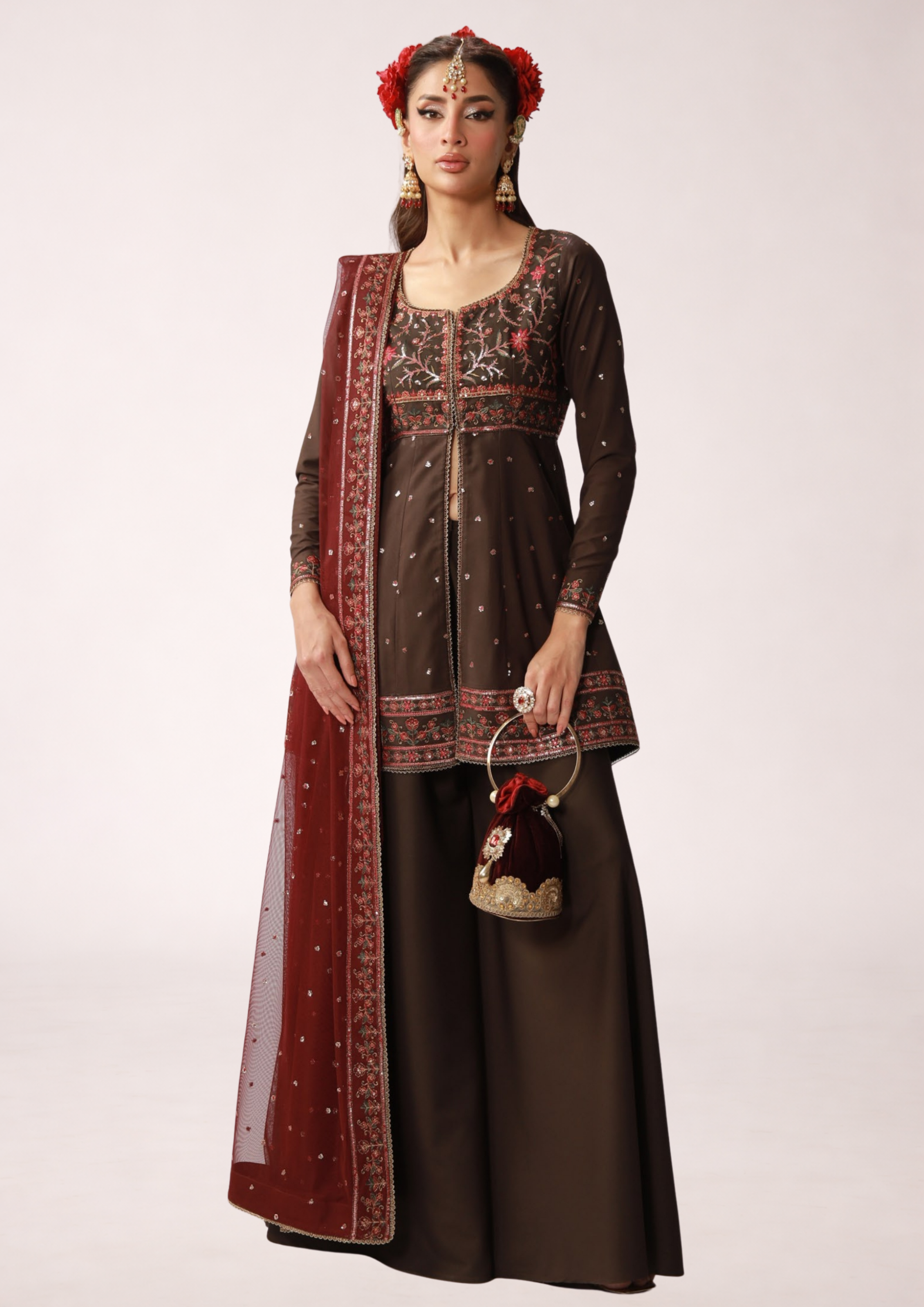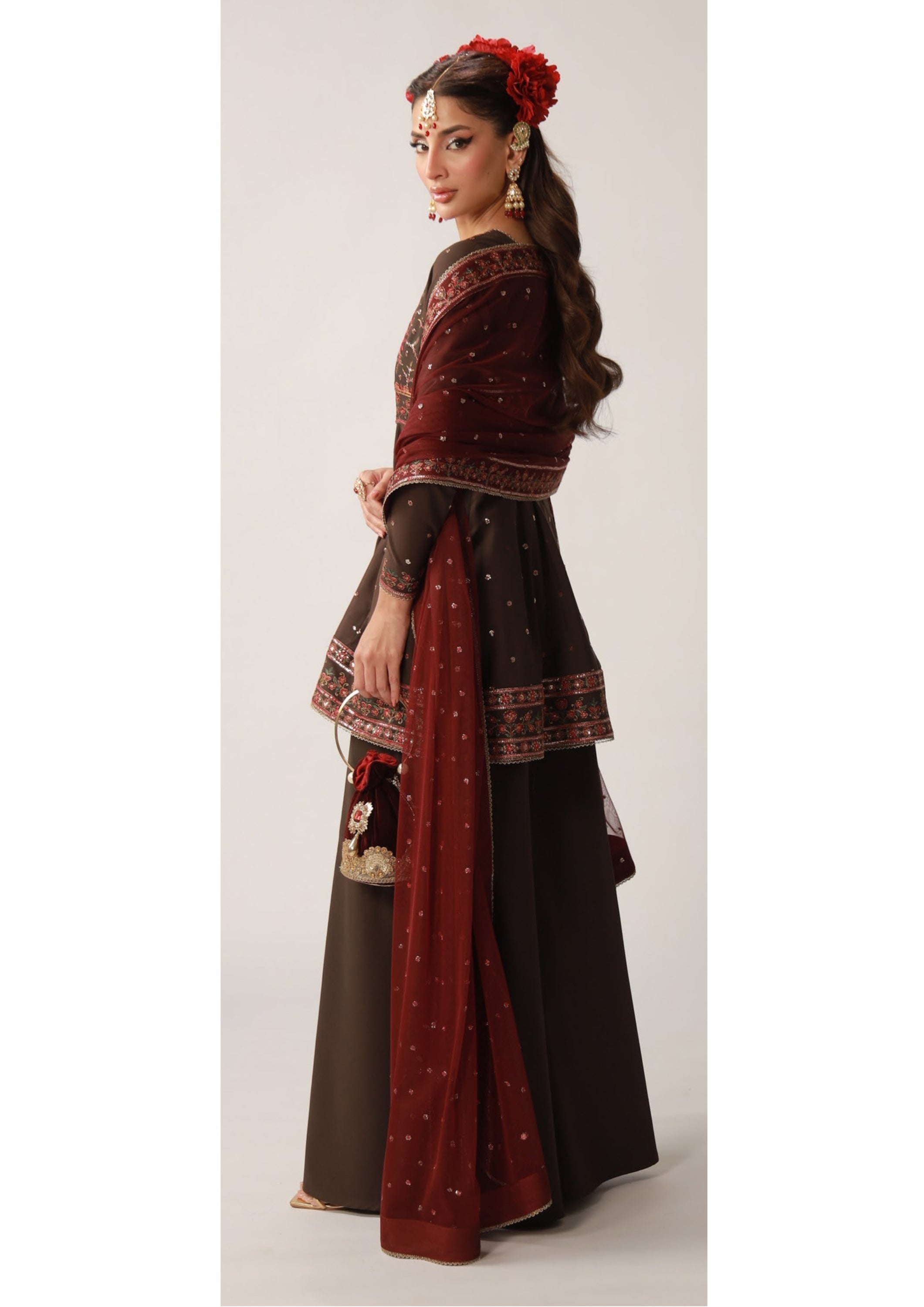 A gracefully detailed silk ensemble designed for festive elegance.