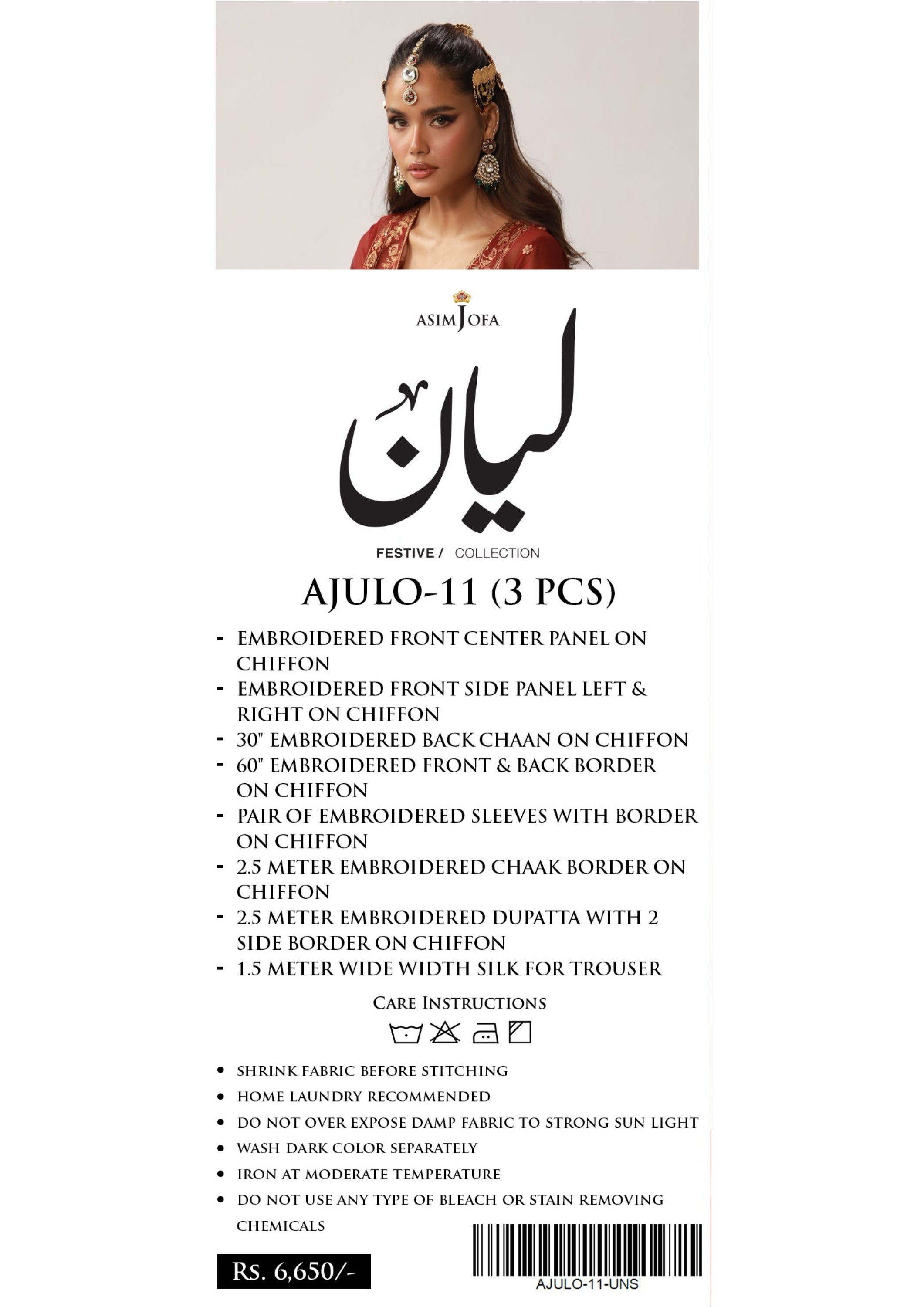 This graceful festive ensemble from Asim Jofa is crafted on airy chiffon fabric and adorned with intricate embroidery that adds elegance and softness to the overall look. Featuring finely embroidered panels, delicate borders, and a beautifully detailed dupatta, this outfit is paired with silk trouser fabric to complete a refined festive style.