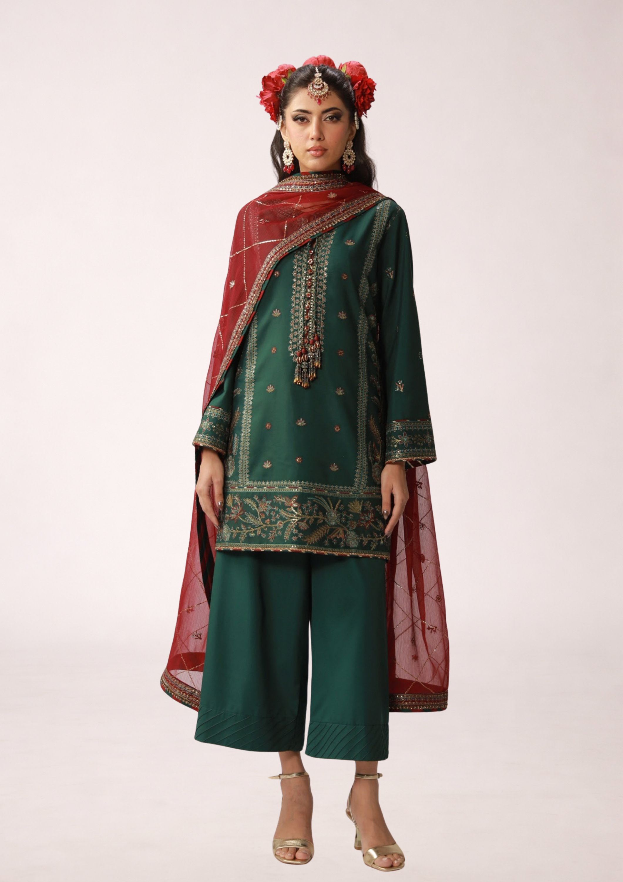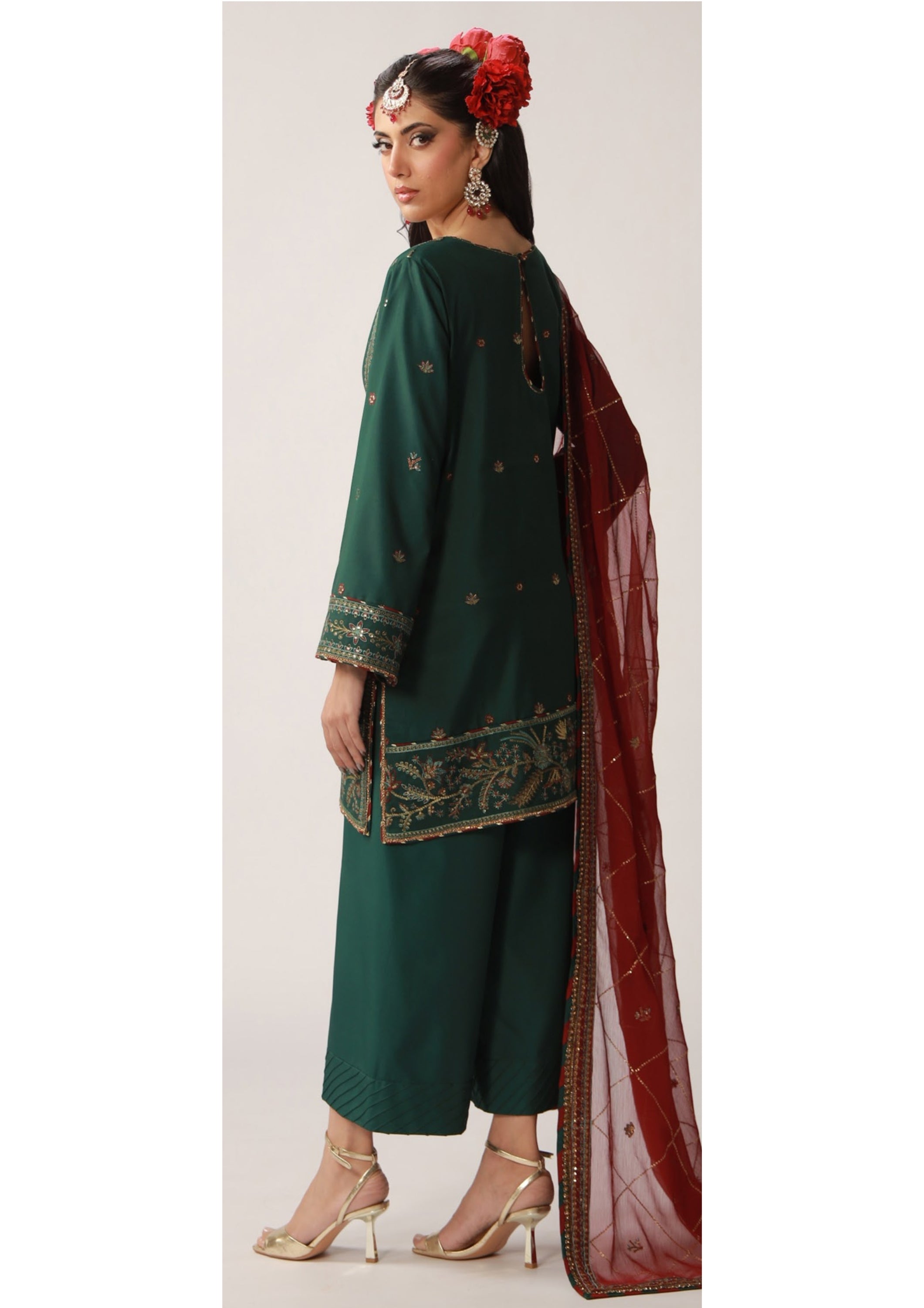 A richly detailed silk ensemble perfect for festive occasions.